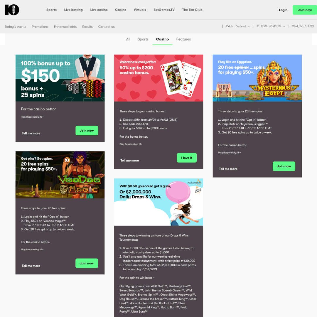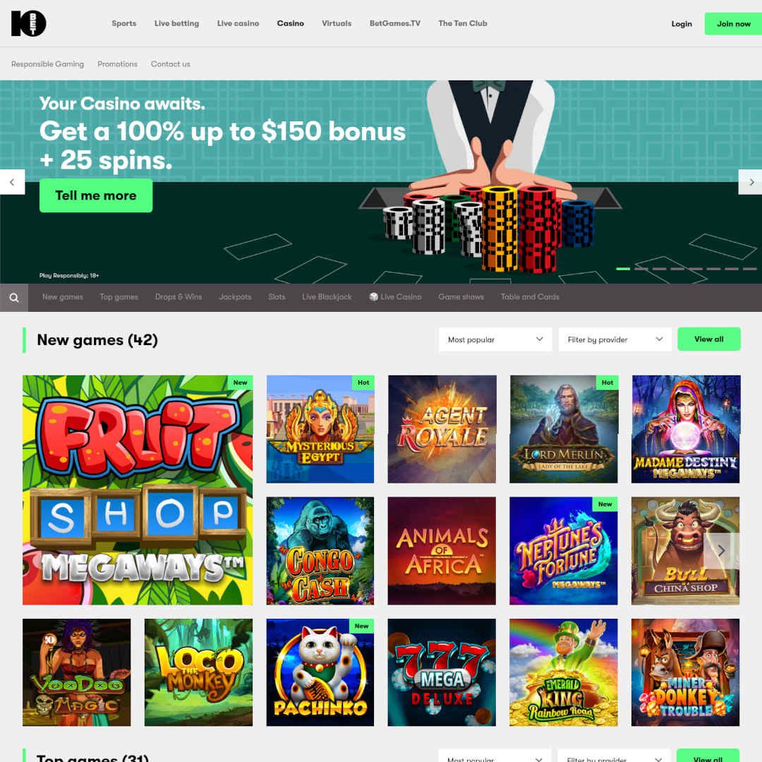 10Bet Casino bietet von Anfang an eine aufregende und benutzerfreundliche Oberfläche. Die dezenten Farben der Website werden durch die saubere und übersichtliche Atmosphäre ergänzt, die die Website bietet. Dies hilft den Spielern, den 10bet Casino Bonus und andere Funktionen wie Spiele ganz einfach zu suchen und zu finden.