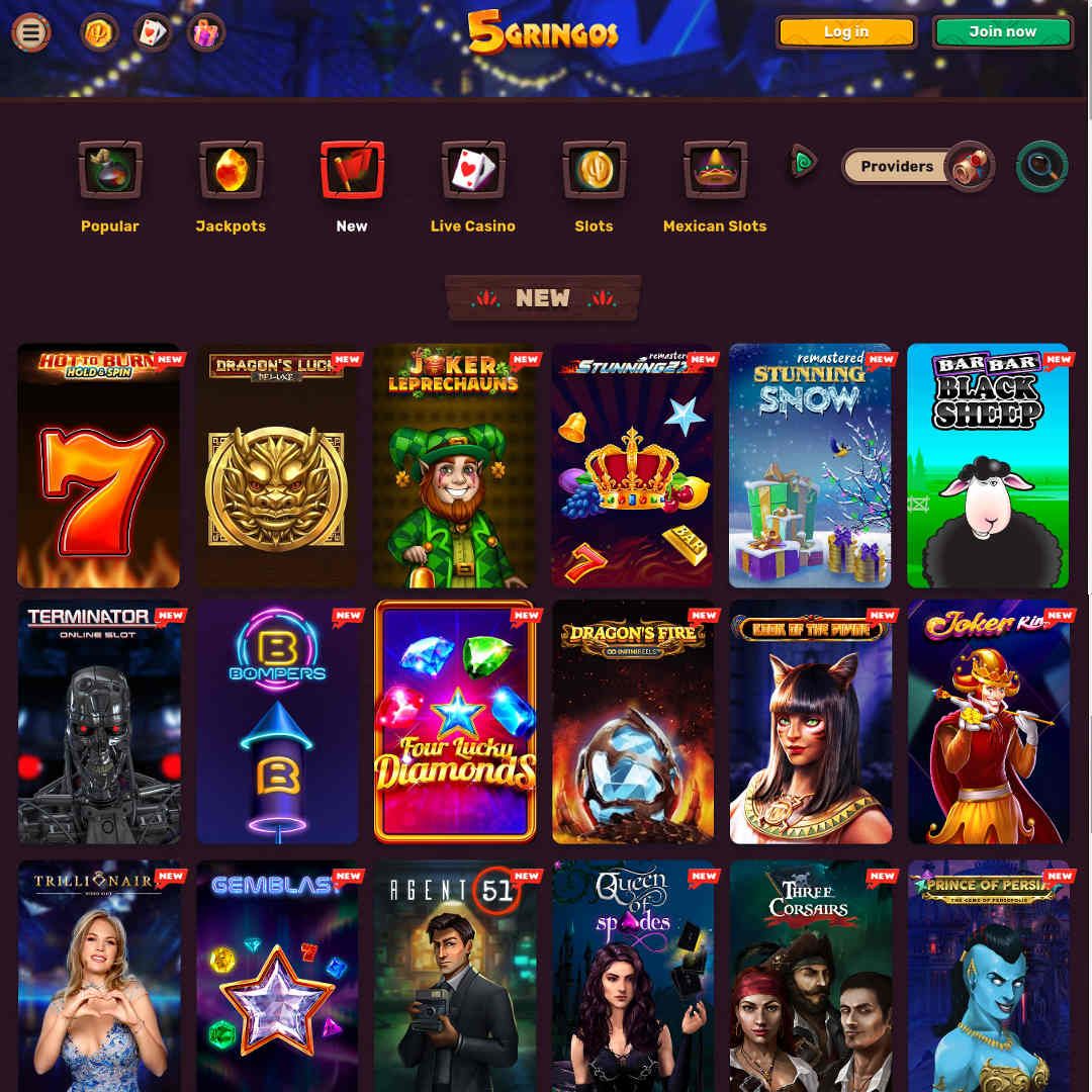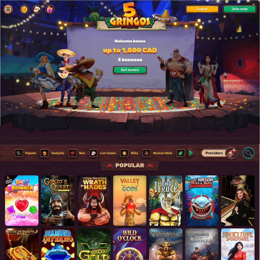 Wie der Name schon sagt, ist 5Gringos Casino eine Website mit mexikanischem Thema, deren Startseite an viele mexikanische Feste erinnert. Die Hauptseite selbst ist mit übersichtlichen Menüs und dem angezeigten 5Gringos Casino Bonus einfach zu navigieren und sofort zugänglich.