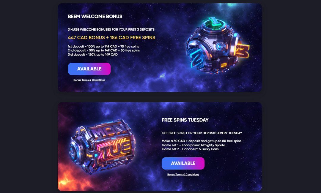 Beim Spielen in einem Online-Casino geht es darum, einen guten Vorsprung zu erzielen. In diesem Sinne bieten die meisten Online-Casinos den Spielern eine Menge verschiedener Belohnungen und Boni, um ihr Spiel noch aufregender zu machen. Im Beem Casino gibt es einen ziemlich tollen Willkommensbonus, der nur darauf wartet, von neuen Spielern in Anspruch genommen zu werden.