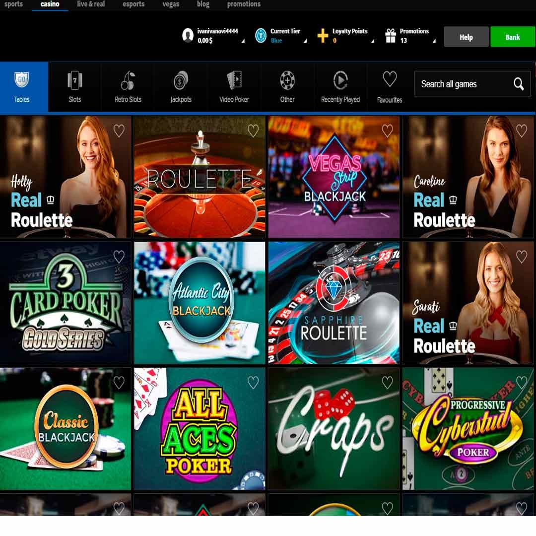 Oben auf der Seite werden verschiedene Kontooptionen und Informationen aufgelistet. Leider sind die Anpassungsoptionen sehr begrenzt und Sie können nur die Sprache ändern. Direkt darunter finden Sie auffällige Bilder von Sonderangeboten und Werbeaktionen, gefolgt von den Casinospielen. Diese sind nach Typ in verschiedene Registerkarten unterteilt – Roulette, Blackjack, Slots usw. Alles ist intuitiv, sodass Sie keine Probleme haben, Spiele zu finden, an denen Sie interessiert sind.