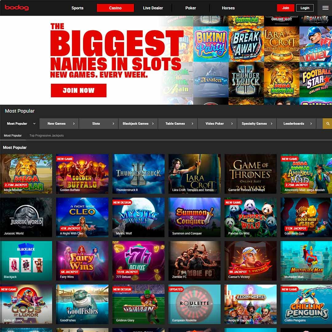 Alle Bereiche der Website wirken vertraut und sind einfach zu navigieren. Es gibt verschiedene Registerkarten, über die Sie auf verschiedene Spielgenres, Kontooptionen, Hilfe und mehr zugreifen können. Halten Sie Ausschau nach Bodog Casino Bonuscodes ohne Einzahlung, um die Website kostenlos auszuprobieren.