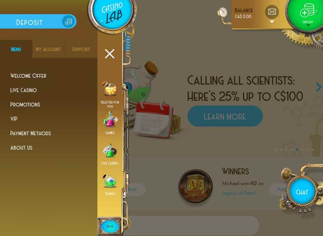 Casino Lab bietet Spielern eine Fülle von Werbeaktionen. Zu Beginn gibt es einen großzügigen Willkommensbonus, der eine Match-Einzahlung mit Freispielen kombiniert, die sich über die ersten vier getätigten Einzahlungen erstrecken. Dies gilt für das Hauptcasino, aber das Live-Casino hat sein Anmeldeangebot.