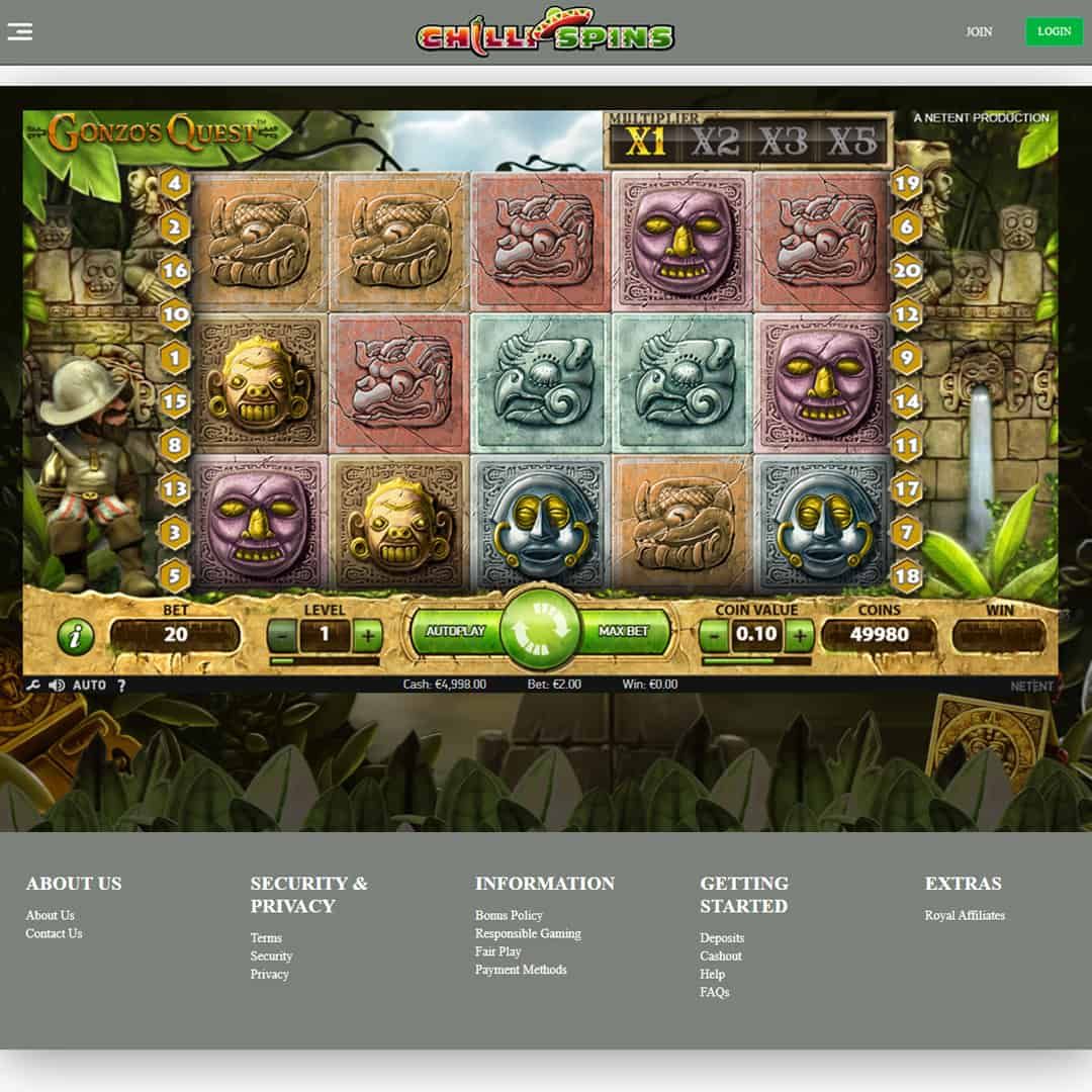 Chilli Spins ist ein brandneues Online-Casino für 2019 und die Grafiken spiegeln dies wider. Die Grafiken sind modern, lustig und passen perfekt zum Thema mit einem amüsanten mexikanischen Thema mit Männern in Sombreros und Kakteen auf der Homepage. Natürlich gibt es auch eine Chili im Spiellogo. Das Navigieren auf dieser Website ist einfach mit der Seitenleiste, die eine Registerkarte zum Suchen nach Spielen, Werbeaktionen, dem exklusiven Club und anderen Informationen zu Einzahlungen, Auszahlungen und vielem mehr enthält. Spiele können auch einfach über die Registerkarten oben auf der Seite aufgerufen werden, nämlich Casino, Live Casino und Rubbelkarten. Dies ist eine für Mobilgeräte optimierte Website, sodass Sie in Ihrem mobilen Browser ein ähnliches Layout finden, wenn Sie unterwegs spielen.