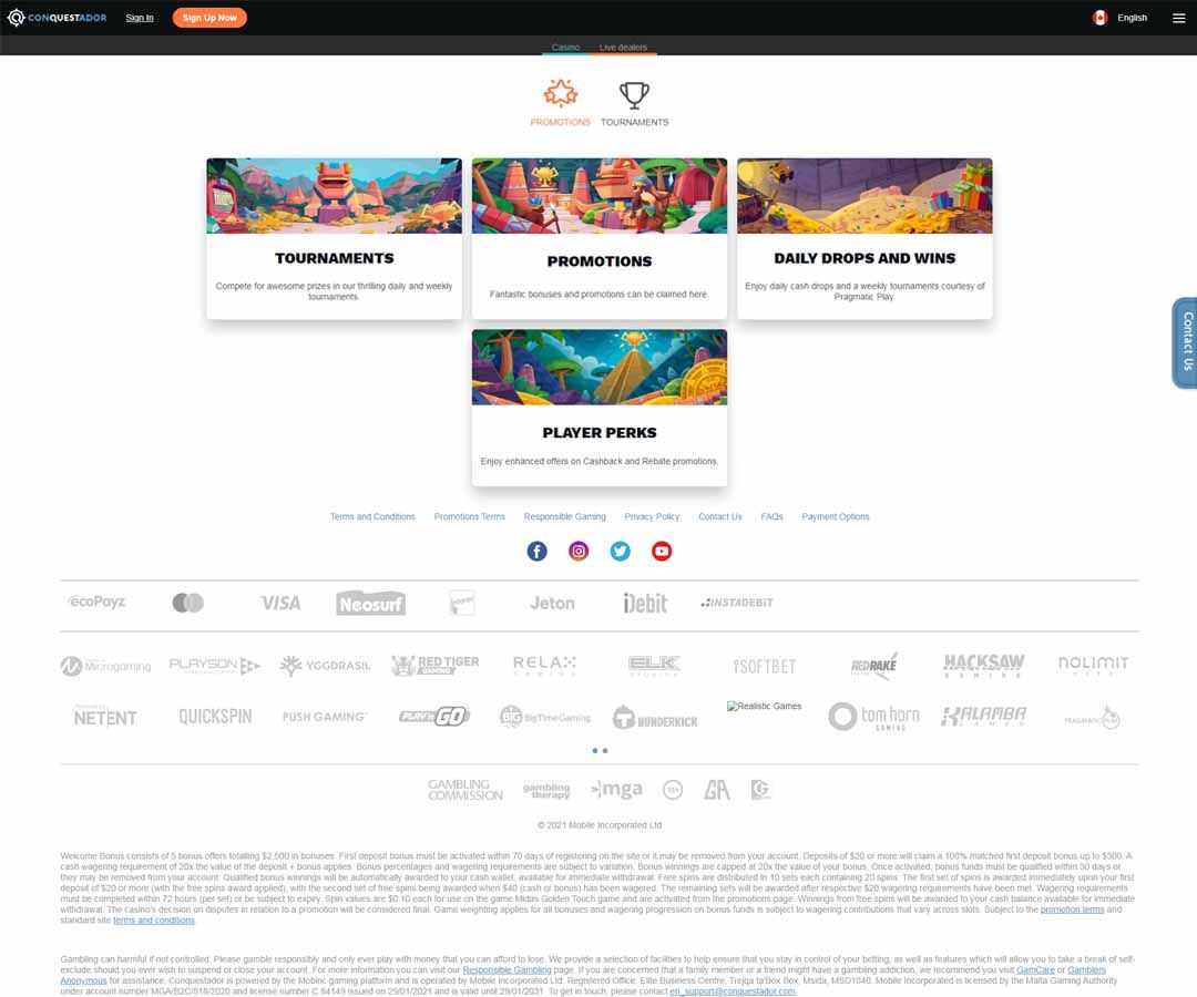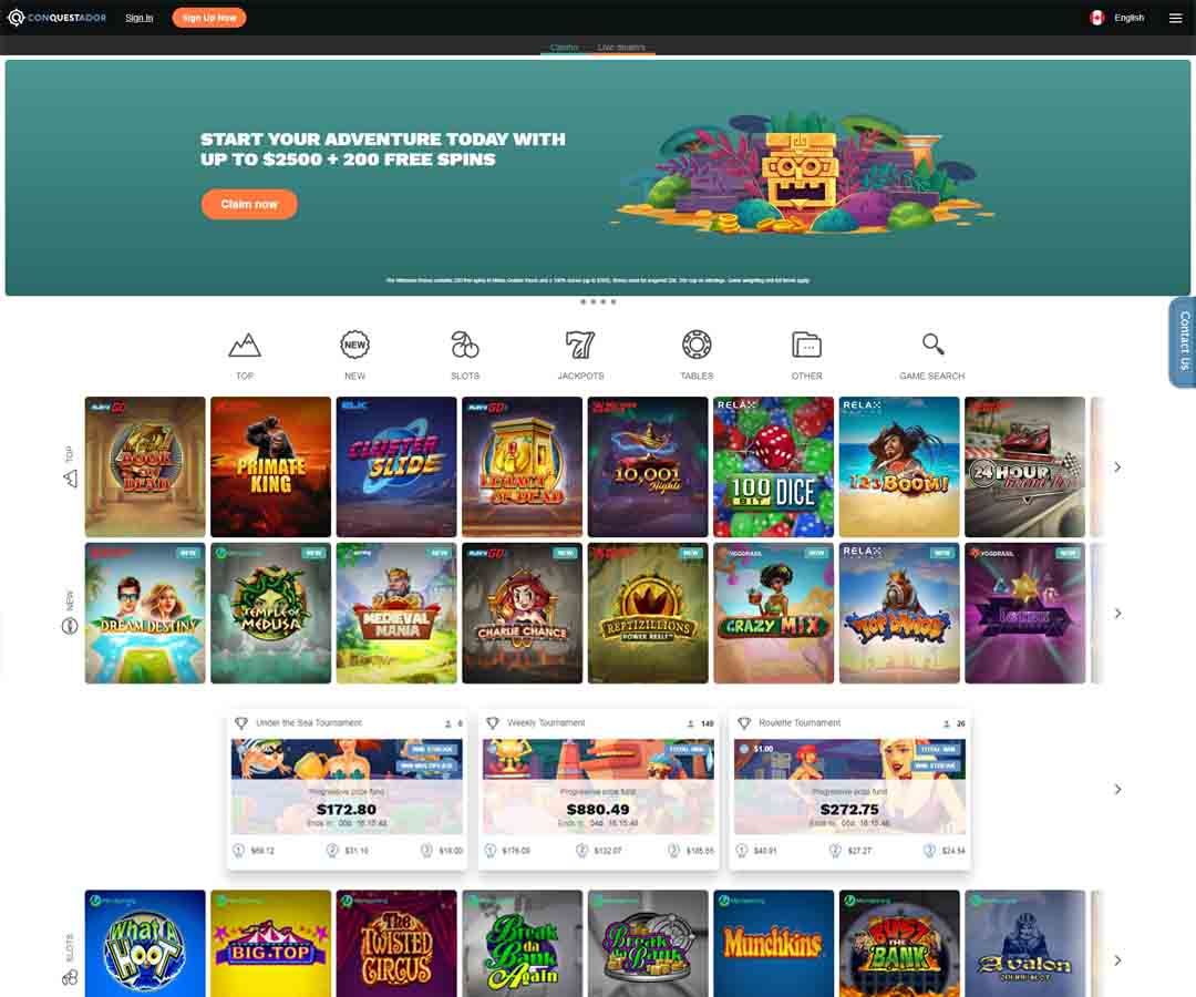 Wenn Spieler die offizielle Website von Conquestador betreten, greifen sie auf pure Unterhaltung zu und tun dies mit Leichtigkeit. Die sanften Farben der Benutzeroberfläche gefallen dem Auge. Live- und Casinospiele sind 2 Hauptbereiche, zwischen denen Spieler jederzeit wechseln können. Um sich anzumelden oder einzuloggen, können Spieler die Symbole links verwenden. Jeder Schritt des Anmeldeformulars enthält Anweisungen, damit Neuankömmlinge nicht verloren gehen.