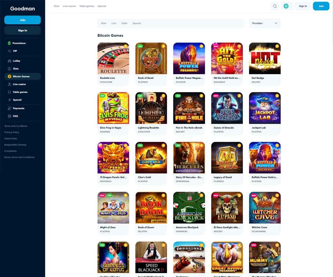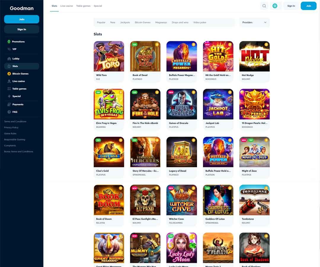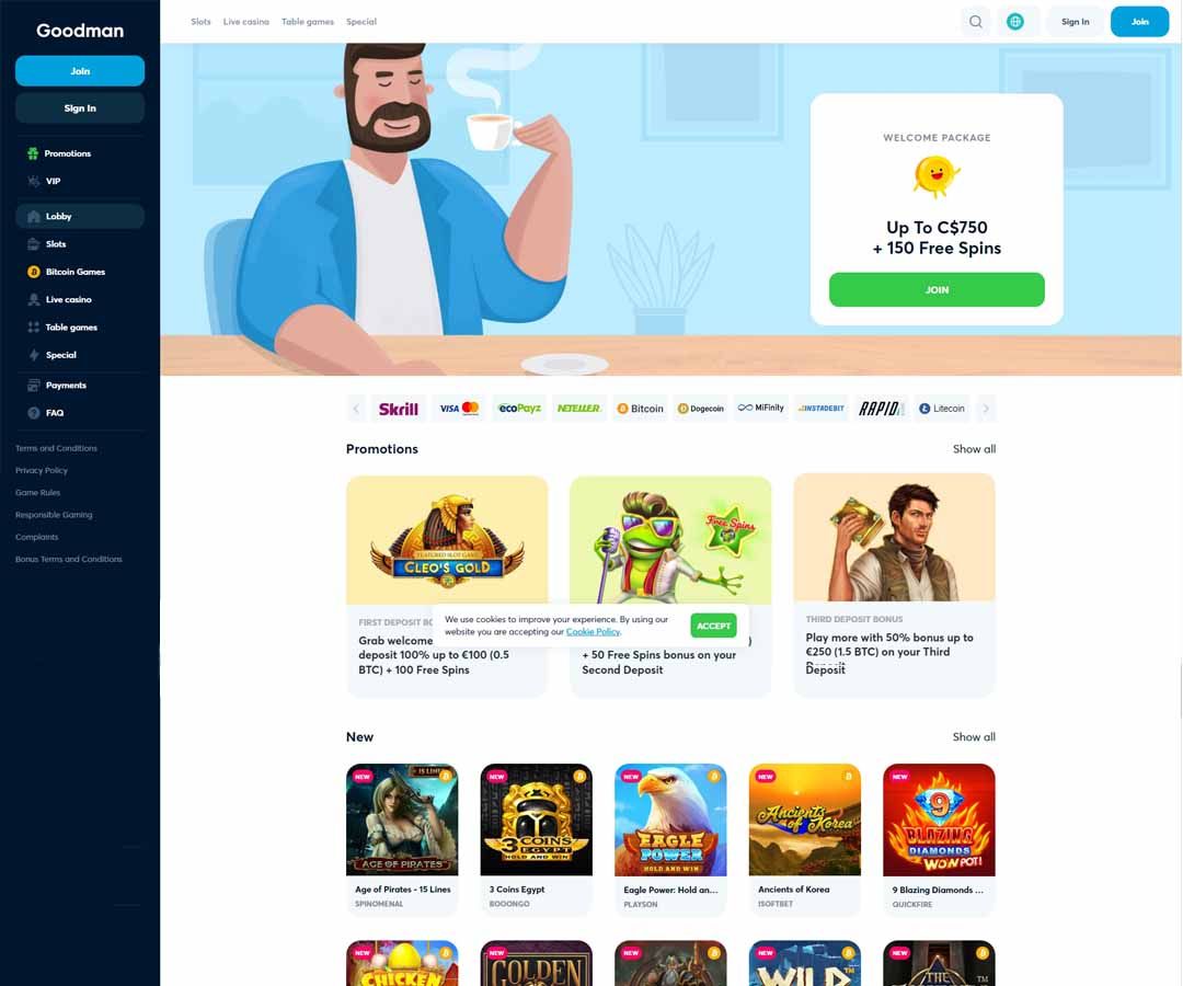 Goodman Casino hat ein einfaches weißes und marineblaues Design. Alles ist auch ordentlich angelegt, wobei die verschiedenen Bereiche für die Site auf der linken Seite der Hauptseite aufgelistet sind. Um den Spielern bei der Auswahl des besten Casinos zu helfen, werden wir alle Funktionen in diesem Goodman Casino-Test analysieren.