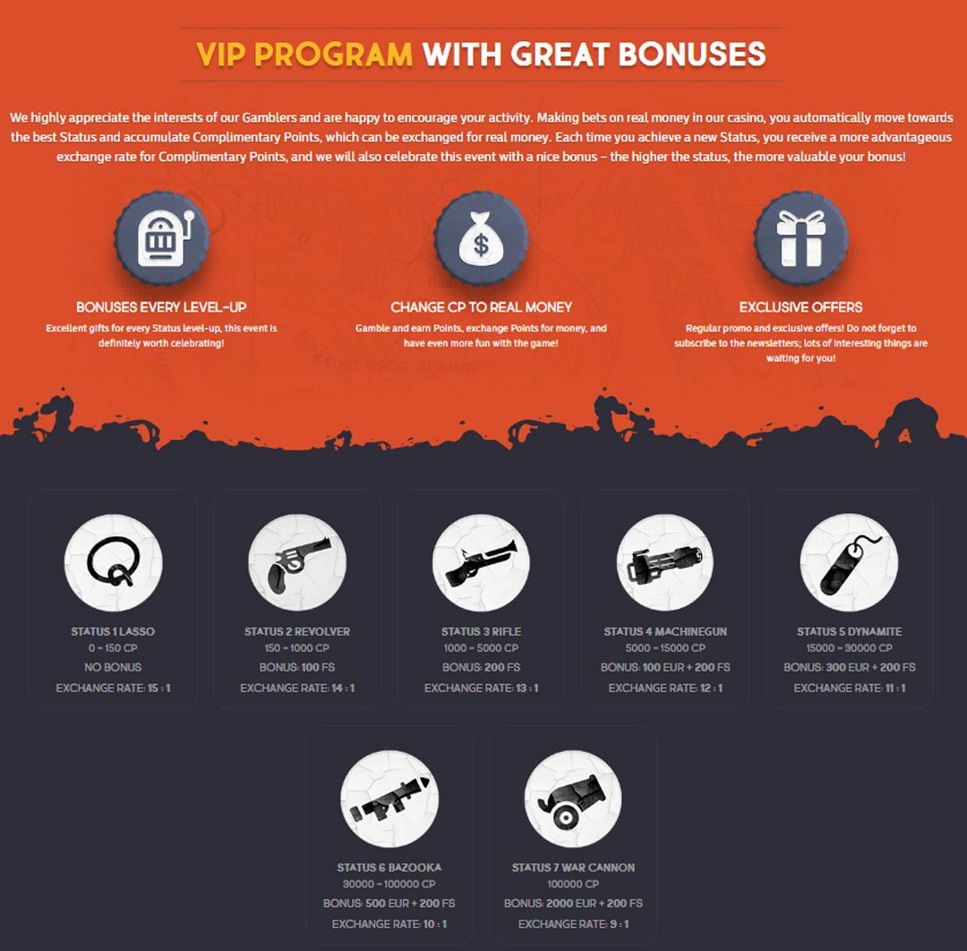 Ja, Gunsbet Casino schaМ€tzt seine treuen Spieler und bietet ein VIP-Programm, durch das Sie sich nach oben arbeiten koМ€nnen. Alles, was Sie tun muМ€ssen, ist einzahlen und echtes Geld fuМ€r Casinospiele spielen, um Punkte zu sammeln und je mehr Punkte Sie erhalten, desto besser werden die VerguМ€nstigungen sein. Die Level, durch die du klettern musst, sind Lasso, Revolver, Gewehr, Maschinengewehr, Dynamit, Status 6-Panzerfaust und Kriegskanone.