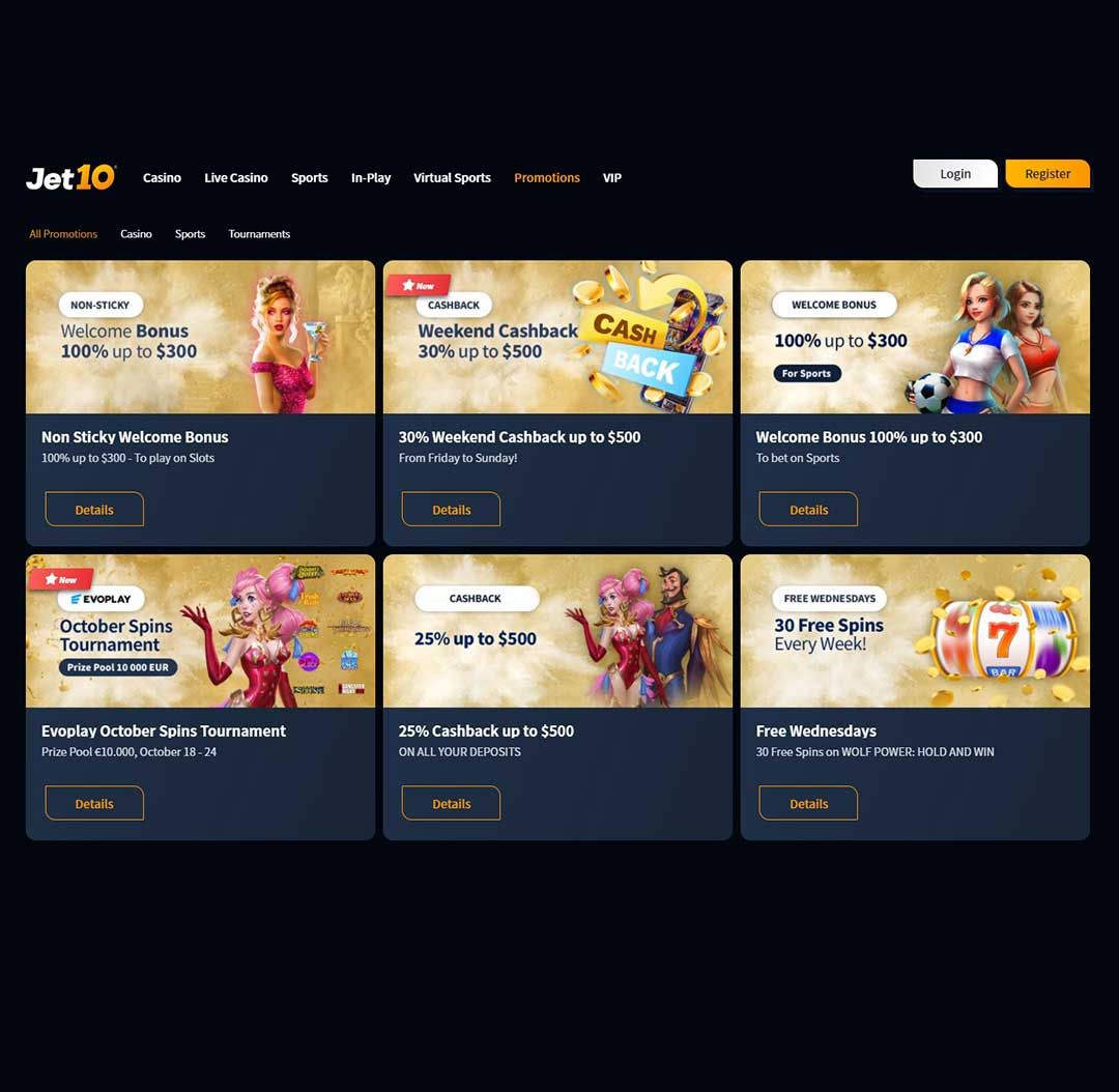 Wenn es darum geht, den Spielern mehr zu geben, hat Jet10 Casino es wirklich in Ordnung gebracht. Das Casino bietet einen hervorragenden Willkommensbonus für neu angemeldete Spieler. Im Gegensatz zu anderen Casinos ist dies jedoch ein einfacher Einzahlungsbonus, der eine 100% ige Übereinstimmung bis zu einem Wert von 300 € bietet. Der Mindesteinzahlungsbetrag beträgt 20 €.
