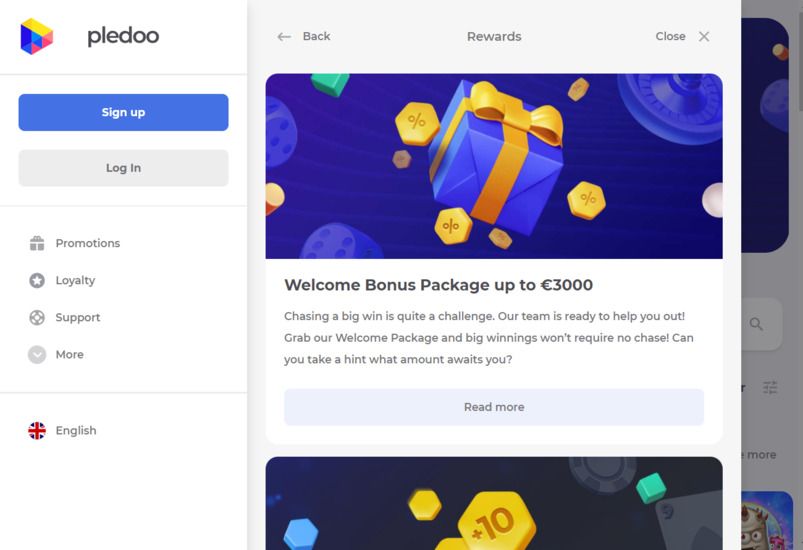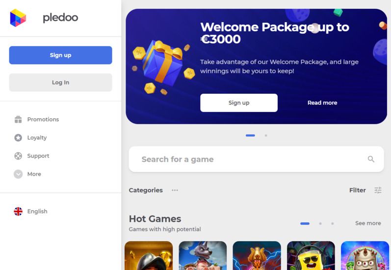 Es verfügt über einen Filter, mit dem Sie ein Spiel eines bestimmten Softwareanbieters auswählen können. Außerdem zeigt Pledoo Ihre zuletzt gespielten Spiele in der Lobby an. Für eine persönlichere Erfahrung können Sie die Site-Sprache unten im Hauptmenü ändern.