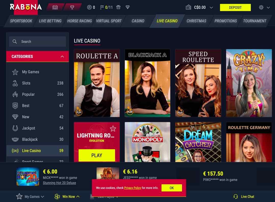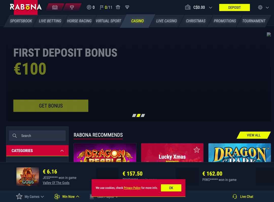 Rabona Casino ist relativ neu, da es 2019 gegründet wurde. Es ist jedoch bereits gelungen, treue Anhänger zu gewinnen, und wir werden Ihnen in diesem Rabona Casino-Test zeigen, warum. Für den Anfang bietet die Site eine saubere und übersichtliche Oberfläche mit minimaler Unordnung, sodass Sie problemlos navigieren können. Die Seite hat auch ein elegantes blaues, rotes und gelbes Thema, das nur zur professionellen Atmosphäre beiträgt. Oben finden Sie alle schnellen Links, einschließlich Sportwetten, Live-Wetten, virtueller Sport, Casino, Live-Casino, Weihnachtsoptionen und Rabona Casino-Boni und -Aktionen.