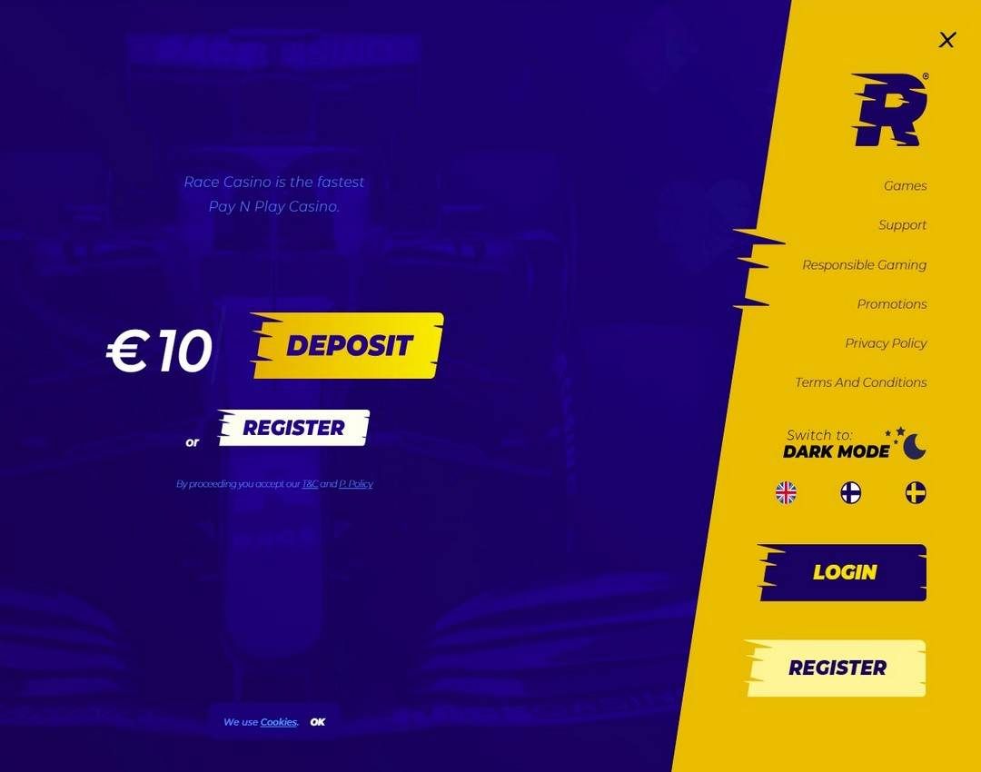 Race Casino hat eine sehr einfache blaue und gelbe Oberfläche. Wenn Sie den Mauszeiger auf die rechte Seite der Site bewegen, befindet sich das Dropdown-Menü. Hier finden Sie alle Hauptbereiche der Website auf einen Klick. Wir werden in diesem Race Casino-Test mehr über diese Plattform erfahren.