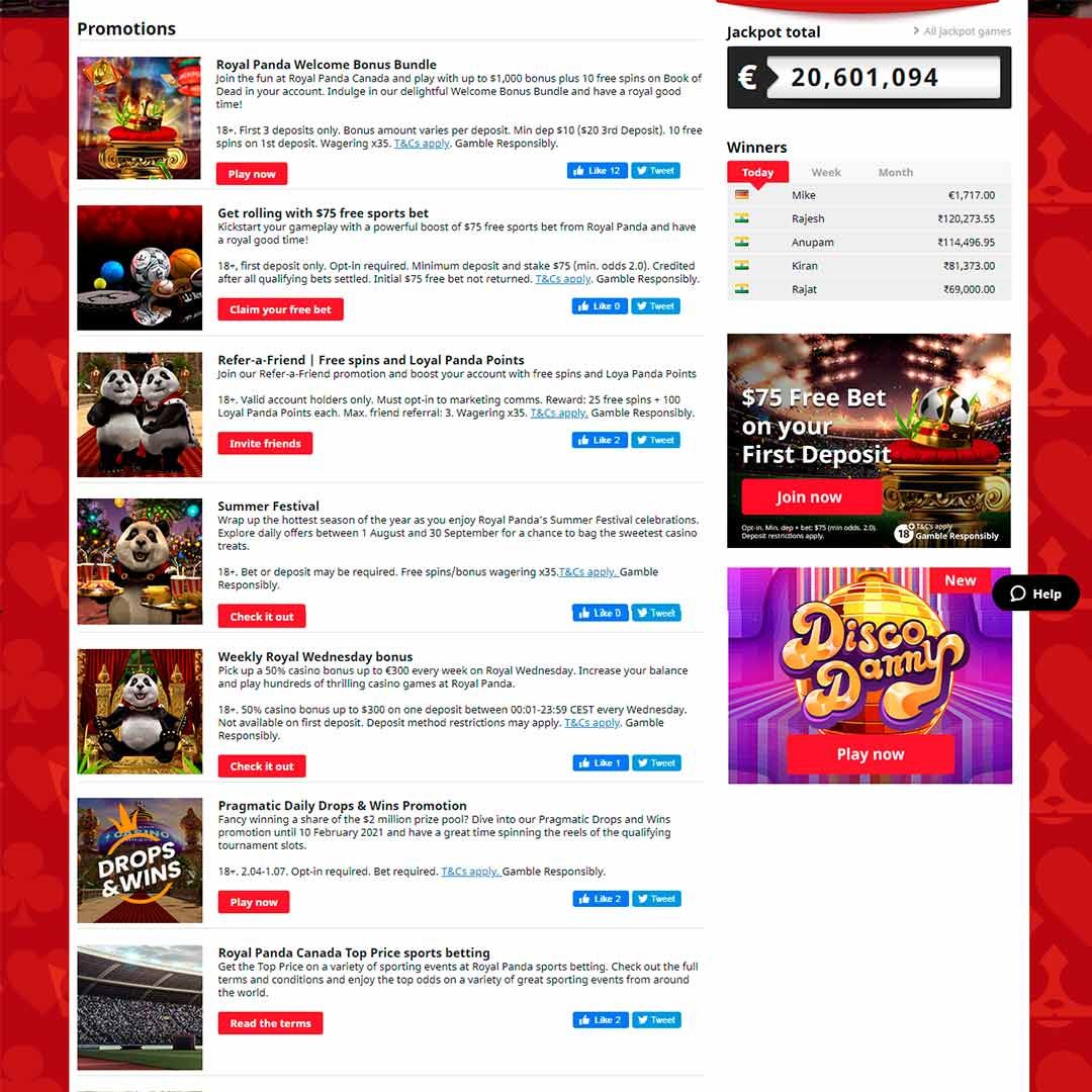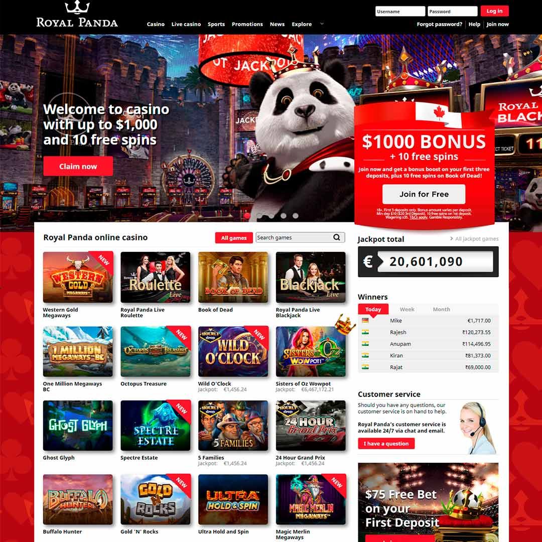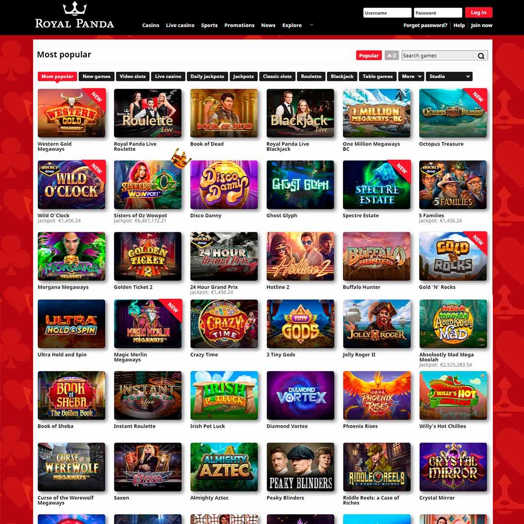 Royal Panda Casino verfügt über ein süßes und stilvolles Design, das eine einfache Navigation ermöglicht. Ästhetisch gehört es zu den besten. Das weiße Logo inmitten des schwarzen Hintergrunds bringt das Panda-Thema perfekt zur Geltung. Im obersten Teil ist das Menü in Casino, Live Casino, Sport, Aktionen, Nachrichten und Erkunden unterteilt.