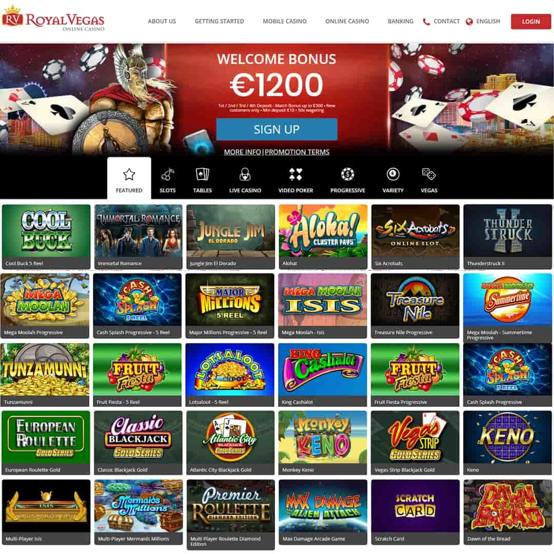Wie Sie es von einem Online-Casino mit diesem Namen erwarten würden, verleiht das Website-Design im Royal Vegas Casino einen Hauch von Eleganz. Diese Site hat ein rotes, goldenes und weißes Thema mit einer Krone, die das Site-Logo bildet. Die Grafiken sind gut und zeigen deutlich die auf der Website verfügbaren Werbeaktionen an. Das Navigieren auf der Website ist super einfach mit dem Menü, das Sie direkt zu den Spielen auf der Website, Bankoptionen und vielem mehr führt. Die Menüleiste für den Spielebereich macht es einfach, die gewünschten Spiele zu finden, wobei die Spiele in verschiedene Kategorien unterteilt sind, darunter Featured, Slots, Tische, Live Casino, Videopoker, Progressive und Variety.