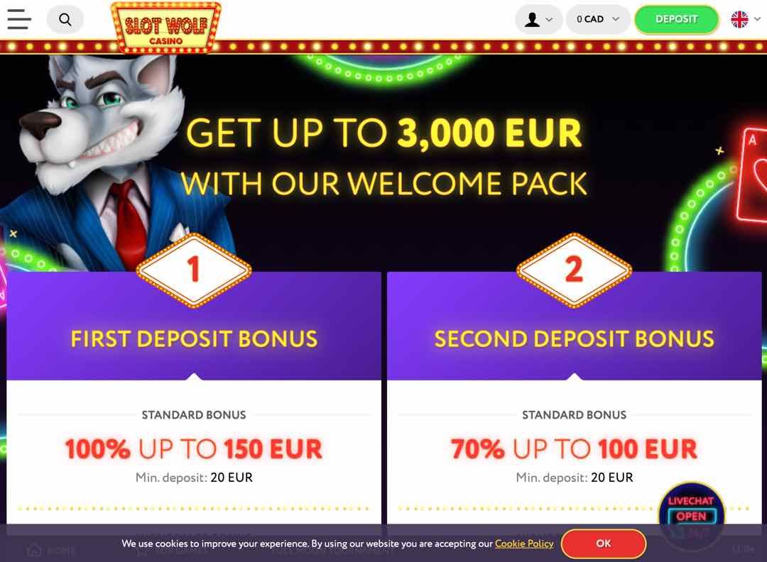 SlotWolf Casino bietet eine umfangreiche Auswahl an Boni und Werbeaktionen. Wie üblich ist einer der lukrativsten der Willkommensbonus für neue Spieler. Deutsche, die zum ersten Mal auf der Website sind, erhalten einen dreiteiligen Bonus. Dies besteht aus einem 100% Match bis zu 250 EUR bei Ihrer ersten Einzahlung, gefolgt von einem 75% Match bis zu 300 EUR bei Ihrer zweiten Einzahlung. Wenn Sie die dritte Einzahlung tätigen, haben Sie Anspruch auf eine 50% ige Übereinstimmung von bis zu 350 EUR, was insgesamt 900 EUR Bonusgeld ergibt, wenn Sie die Höchstbeträge einzahlen.