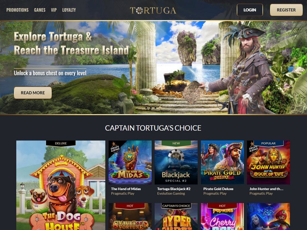 Der Kapitän des Tortuga Casinos begrüßt die Spieler und lädt sie zu einer Website ein, die aufgrund ihres intelligenten Menüs bequem zu bedienen ist. Sie werden ein einfaches, aber schönes Design sowie eine Reihe von Möglichkeiten zu schätzen wissen, um weitere Informationen über das Projekt zu erhalten. Sie können das obere Menü verwenden, sich über die Begriffe informieren, die FAQ lesen und mühelos einen Sprachabschnitt unten rechts finden.
