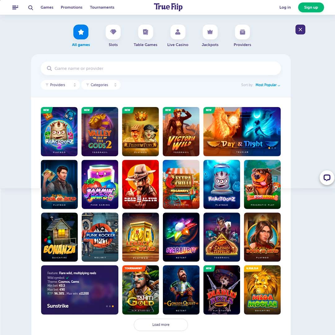 Das erste, was Sie nach dem Öffnen von TrueFlip Casino bemerken werden, ist die elegante Website und der dunkelblaue Hintergrund. Die Benutzeroberfläche ist gut organisiert und der Inhalt der Homepage konzentriert sich auf wichtige Aspekte des Casinos. Mit einem Klick können Sie die Spiele durchsuchen oder zu den Unterseiten für Werbeaktionen oder Turniere gehen. Dies macht die Navigation auf der Website reibungslos und nahtlos.