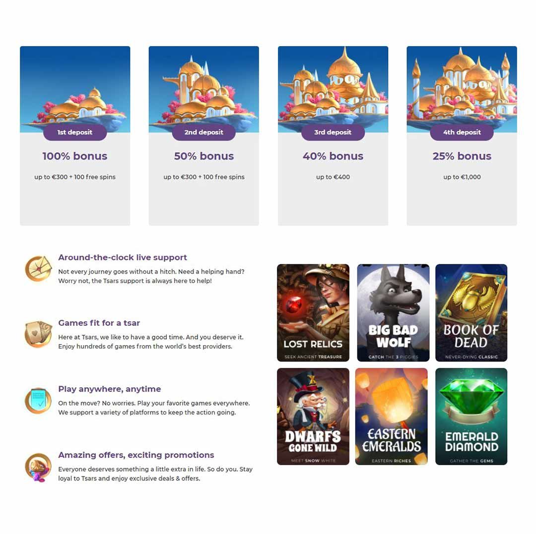 Tsars Casino bietet deutschen Spielern eine wirklich beeindruckende Auswahl an Boni. Das erste davon ist ein beeindruckendes Willkommensangebot. Im Gegensatz zu vielen anderen Casinos teilt Tsars Casino diesen Bonus auf vier verschiedene Einzahlungen auf. Dies bedeutet, dass Spieler auch nach der ersten Einzahlung weiterhin belohnt werden können. Besser noch, bei dieser ersten Einzahlung werden auch Freispiele vergeben, damit die Spieler auch ein bestimmtes Automatenspiel genießen können.