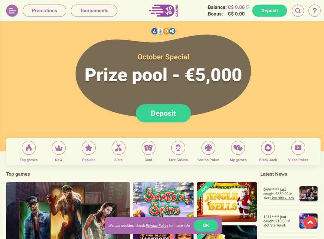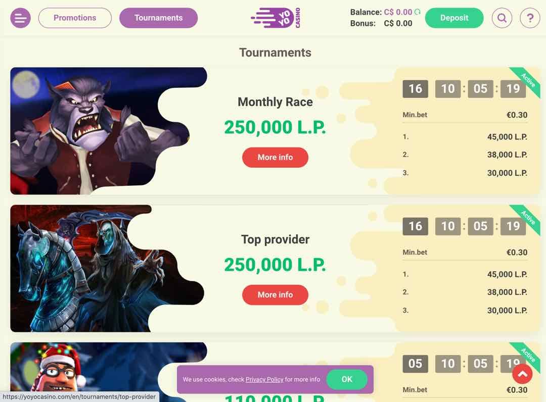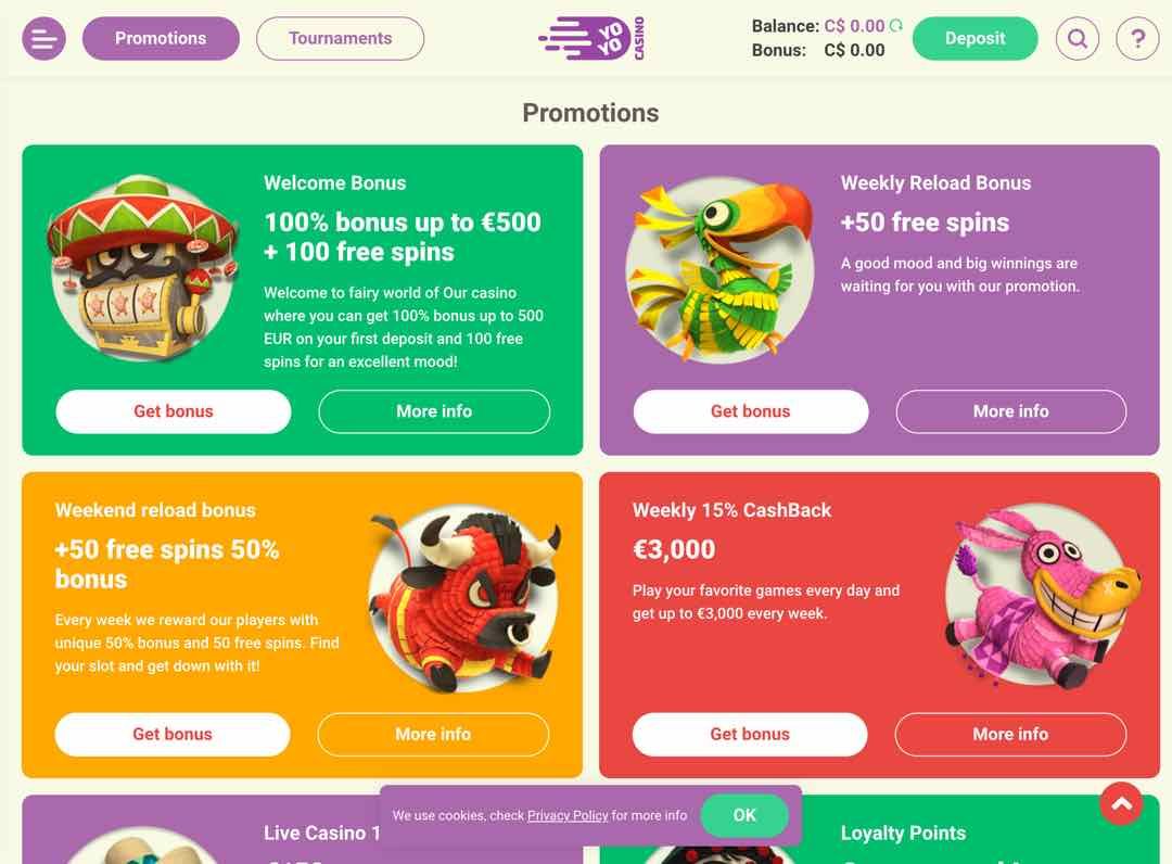 Wie zu erwarten, bietet YoYo Casino eine Reihe verschiedener Boni und Werbeaktionen sowohl für neue Spieler als auch für Langzeitspieler. Es gibt einen Willkommensbonus, der neuen Spielern sowohl zusätzliches Geld als auch mehrere Freispiele bietet. Darüber hinaus gibt es einen wöchentlichen Reload-Bonus, einen Wochenend-Reload-Bonus und sogar Cashback-Optionen, ebenfalls jede Woche.